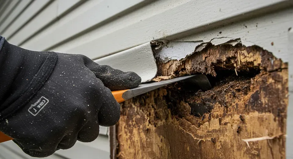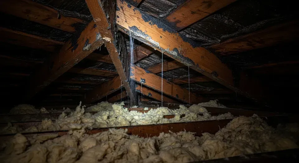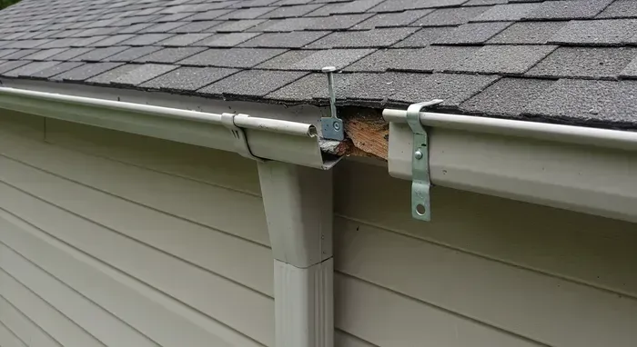 The complete saturation and rot of the roof's edge components. The constant moisture from the backed-up gutter first destroys the fascia board and then decays the ends of the roof rafters (rafter tails) and the wooden roof sheathing they support. This structural decay creates a direct pathway for water to enter the attic.